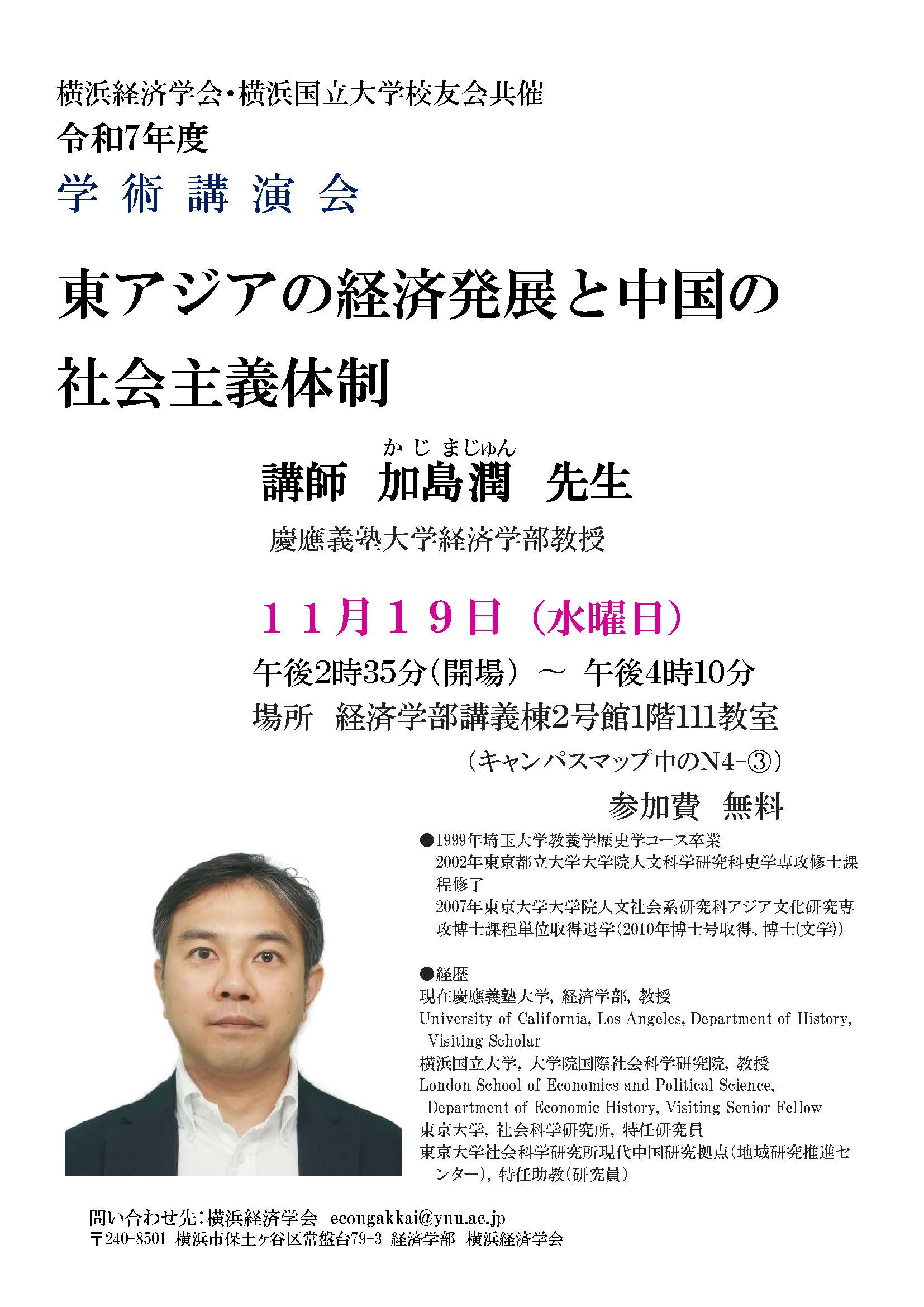 日 時:11月19日(水)午後2時35分(開場) 〜 午後4時10分 場 所:経済学部講義棟2号館1階111教室 (キャンパスマップ中のN4-⓷) 参加費:無料 問い合わせ先:横浜経済学会 econgakkai@ynu.ac.jp