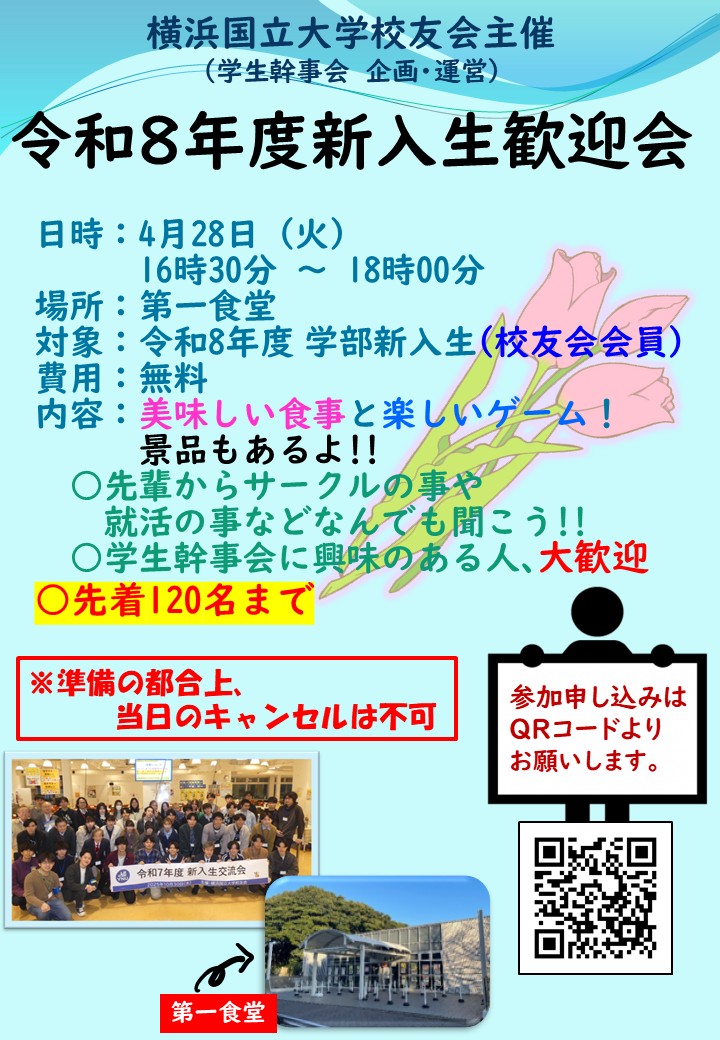 横浜国立大学校友会では、校友会の学生幹事会企画運営による「新入生歓迎会」を下記の通り開催しますので、ぜひ参加し学部を越えた交流を行ってください。また、先輩からサークルや就活のことなどなんでも聞けます。さらに、ご飯を食べたい人や学生幹事会に興味がある方もぜひ参加を!